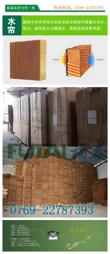 濕簾型號常規(guī)分為:5090 6090 7090 前面兩種是環(huán)?照{(diào)專用。而7090是濕簾墻專用的。厚度一 般為10公分15公分厚。也可以訂做更厚的。這兩種是常用規(guī)格了。濕簾紙如何更換|濕簾片降溫系統(tǒng)的降溫過程是在其核心——濕簾紙內(nèi)完成的;當室外的干熱空氣被風機抽吸穿過濕簾紙時,水膜中的水會吸收空氣中的熱量后蒸發(fā),帶走大量潛熱,使經(jīng)過濕簾紙的空氣溫度降低,經(jīng)過這樣處理后的涼爽空氣進入室內(nèi)。同時在冷卻過程中,清除室外空氣中之粉塵廢氣、增加進氣含氧量,使室內(nèi)空氣更為清新,品質(zhì)更佳;利用風機+濕簾的負壓通風原理,將室內(nèi)的廢氣、污氣排出,徹底解決高溫悶熱環(huán)境,可使室內(nèi)溫度(3245的高溫環(huán)境)迅速地在10分鐘內(nèi)下降,并將溫度保持在2630;不含易使皮膚過敏的苯酚等化學物質(zhì),安裝使用時對人體無毒無害,綠色、安全、節(jié)能、環(huán)保、經(jīng)濟適用。