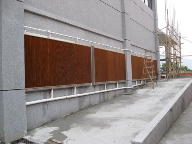 濕簾(水簾)降溫主要利用水蒸發(fā)過(guò)程中水吸收空氣中的熱量,使空氣溫度下降的物理學(xué)原理。在實(shí)際中于負(fù)壓風(fēng)機(jī)配套使用,濕簾裝在密閉房舍一端山墻或側(cè)墻上,風(fēng)機(jī)裝在另一端山墻或側(cè)墻上,降溫風(fēng)機(jī)抽出室內(nèi)空氣,產(chǎn)生負(fù)壓迫使室外的空氣流經(jīng)多孔濕潤(rùn)濕簾表面,使空氣中大量熱量進(jìn)行轉(zhuǎn)化處理從而迫使進(jìn)入室內(nèi)的空氣降低4-10,并不斷的引入室內(nèi)進(jìn)行防暑降溫。