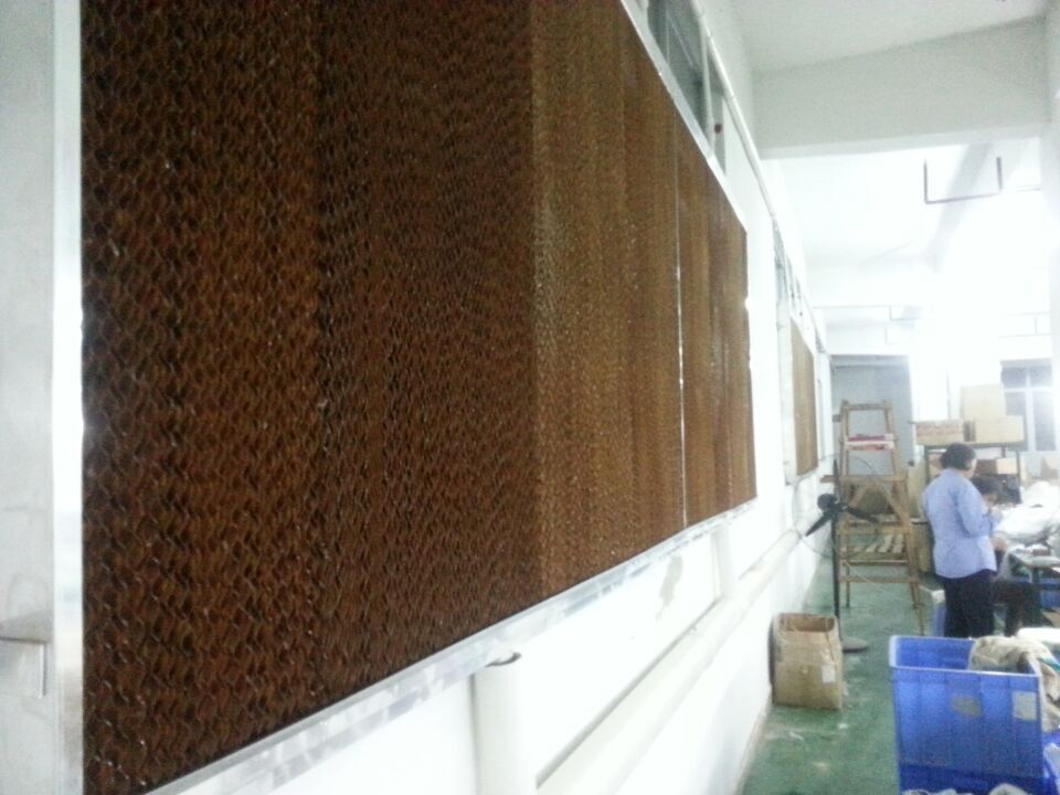 此方案的降溫原理是通過抽風(fēng)機將室內(nèi)的高溫悶熱空氣抽出,另一邊室外的熱空氣通過水簾降溫后補充到車間內(nèi),但由于他的濕度太大,而且易臟易壞又不方便維護保養(yǎng),所以并不建議客戶安裝使用,當然了如果車間內(nèi)不怕濕度同時又想節(jié)省成本的話,這種降溫方案還是非常適用的,但要注意的是由于水簾是由多層波紋纖維疊合物(水簾紙)易損壞,所以在設(shè)計安裝的時候最好加上一層保護隔離網(wǎng)在外面,這樣就能保證它的使用壽命更長。