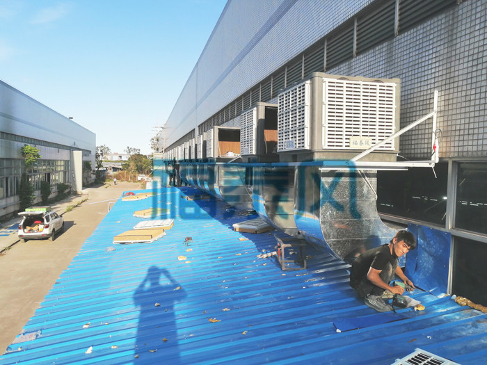 福泰冷風(fēng)機安裝有十幾年了而且每個工廠都是量身定制方案的,冷風(fēng)機在安裝方面有好幾種方式,工業(yè)冷風(fēng)機常規(guī)安裝方式可分為:掛墻安裝、窗戶安裝、樓面安裝、效果設(shè)計安裝類型可分為:直接送風(fēng)(不走管道)管道送風(fēng)星瓦頂安裝、落地安裝;局部(區(qū)域)送風(fēng)機組數(shù)量的計算方法:.換氣次數(shù)的定義:換氣次數(shù)(次/小時)二室內(nèi)總送風(fēng)量( m3lh )十(室內(nèi)面積( mZ ) X 室內(nèi)的高度( m ) ) .使用機組數(shù)量二場地體積 X 換風(fēng)次數(shù)+機組風(fēng)量.冷風(fēng)機機室內(nèi)各種不同安裝方式室內(nèi)送風(fēng)管道必須與空調(diào)機之機型匹配,按實際安裝環(huán)境及出風(fēng)口數(shù)量,設(shè)計合適的送風(fēng)管道,安裝風(fēng)管長度 20 米,而且為保持風(fēng)速,較長的管道一般采用變徑方式。