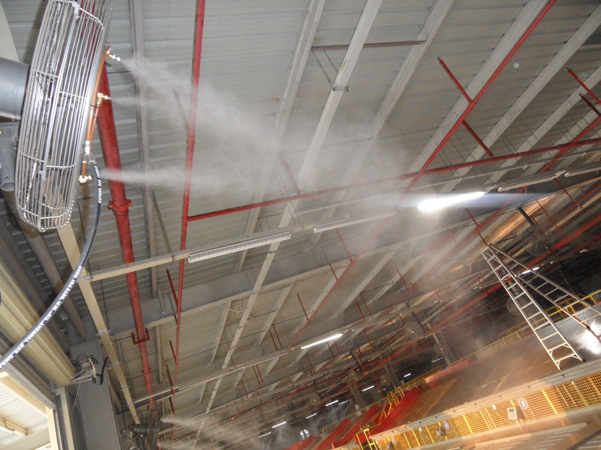 噴霧降溫展示 5.電風(fēng)扇:常見的有吊扇、牛角扇、壁扇、臺扇、落地扇等,這一類設(shè)備優(yōu)點(diǎn)是單臺購買投資比較小,用電較省,維修保養(yǎng)費(fèi)用低,缺點(diǎn)是效果差,安全性差。主要是利用風(fēng)扇扇葉轉(zhuǎn)動的動能攪動熱空氣,引起氣流,不能實(shí)現(xiàn)通風(fēng)換氣,對排出有害氣體不良,造成車間通風(fēng)降溫工程效果差。