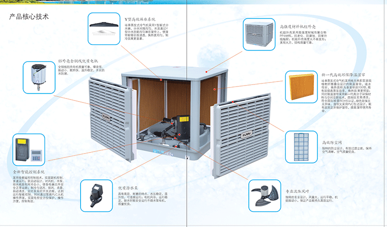 現(xiàn)在90%工廠不知道用低碳節(jié)能環(huán)?照{(diào)又稱蒸發(fā)式冷氣機(jī),分別由水簾、電機(jī)、風(fēng)葉、頂蓋、立柱、底盆、控制面板、排水閥、布水器、水泵等零配件組成,