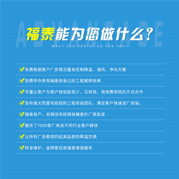 目前水冷空調(diào)和水簾風(fēng)機(jī)適用范圍:1,透用于高溫或有異味的車間:如電鍍處理廠,紡織廠,塑膠料廠,鋼結(jié)構(gòu)廠,制鞋廠皮件電鍍廠環(huán)?照{(diào),化工廠環(huán)?照{(diào)壓軸車間環(huán)?照{(diào),模具廠降溫環(huán)?照{(diào),制衣廠水簾風(fēng)機(jī),紡織車間水簾墻,服裝廠水簾風(fēng)機(jī),服裝廠濕簾墻,塑膠車間環(huán)?照{(diào),塑膠廠水簾風(fēng)機(jī),模具廠環(huán)保空調(diào),模具廠冷風(fēng)機(jī),裝配車間環(huán)保空調(diào),針織廠環(huán)?照{(diào),針織廠水簾風(fēng)機(jī),電子廠環(huán)保空調(diào),繡花水簾風(fēng)機(jī),玩具廠水簾風(fēng)機(jī),手袋廠水簾風(fēng)機(jī),鞋業(yè)廠水簾風(fēng)機(jī),注塑廠水簾風(fēng)機(jī),橡膠水簾風(fēng)機(jī)噴涂環(huán)?照{(diào),電鍍廠環(huán)?照{(diào)。五金廠環(huán)?照{(diào),印刷廠環(huán)?照{(diào),絲印廠環(huán)?照{(diào),食品加工廠環(huán)?照{(diào),漂染廠環(huán)保空調(diào),化工廠環(huán)保空調(diào),陶瓷廠環(huán)?照{(diào),電子車間降溫環(huán)?照{(diào)廠電城廠,各種化工廠福泰都服務(wù)過這種類型的廠家,你的廠房是生產(chǎn)什么的呢!期待能幫助你改善你的車間環(huán)境問題,開始我們的緣分故事也是福泰人的榮幸。 2.通用于勞動密集型企業(yè):如服裝廠 名類裝配車間,網(wǎng)吧等地方目前福泰環(huán)保設(shè)備廠家和箭冠汽車配件廠改善車間降溫問題,箭冠生產(chǎn)汽車線束、汽車塑料連接器、注塑產(chǎn)品、注塑模具等研發(fā)生產(chǎn)的企業(yè)。 其實環(huán)?照{(diào)和水簾風(fēng)機(jī)都屬于開放式降溫,對于很多不想封閉式的廠房都適合用,而且前期投入費用和使用費用都很低,后期也沒有什么耗材使用費用是很多工廠考慮選擇的前提,一個工廠既然要規(guī)劃這些降溫設(shè)備必定在費用的評估和使用上進(jìn)行核算,換算了才會去改造的這些我們都能明白客戶的心思,所以凡是找到福泰環(huán)?照{(diào)廠家降溫通風(fēng)的客戶廠家我們都用心以少的投入成本費用做到一個舒適的降溫效果,這樣才不辜負(fù)客戶的信任,因為我們福泰看到的更遠(yuǎn)的方向幫助更多的客戶改善車間環(huán)境空氣質(zhì)量問題,幫助的客戶越多福泰的成就也越大,但一個企業(yè)以賺錢為信仰的話他可以賺到但絕對不能長久,但一個企業(yè)把這種當(dāng)成一種使命去做后也許贏得的格局更大,品牌價值是福泰人一直要做好做強(qiáng)的目標(biāo)。品牌溢價已經(jīng)不是客戶僅僅安裝一種降溫產(chǎn)品而已,而是一家專業(yè)的廠房降溫規(guī)劃一體化的服務(wù)。你不僅僅享受的是安裝了一個產(chǎn)品,更多的是細(xì)節(jié)的服務(wù)和快速的安裝以及跟蹤服務(wù)。